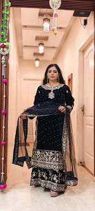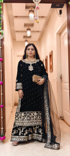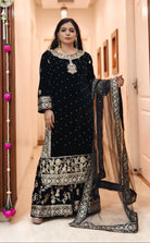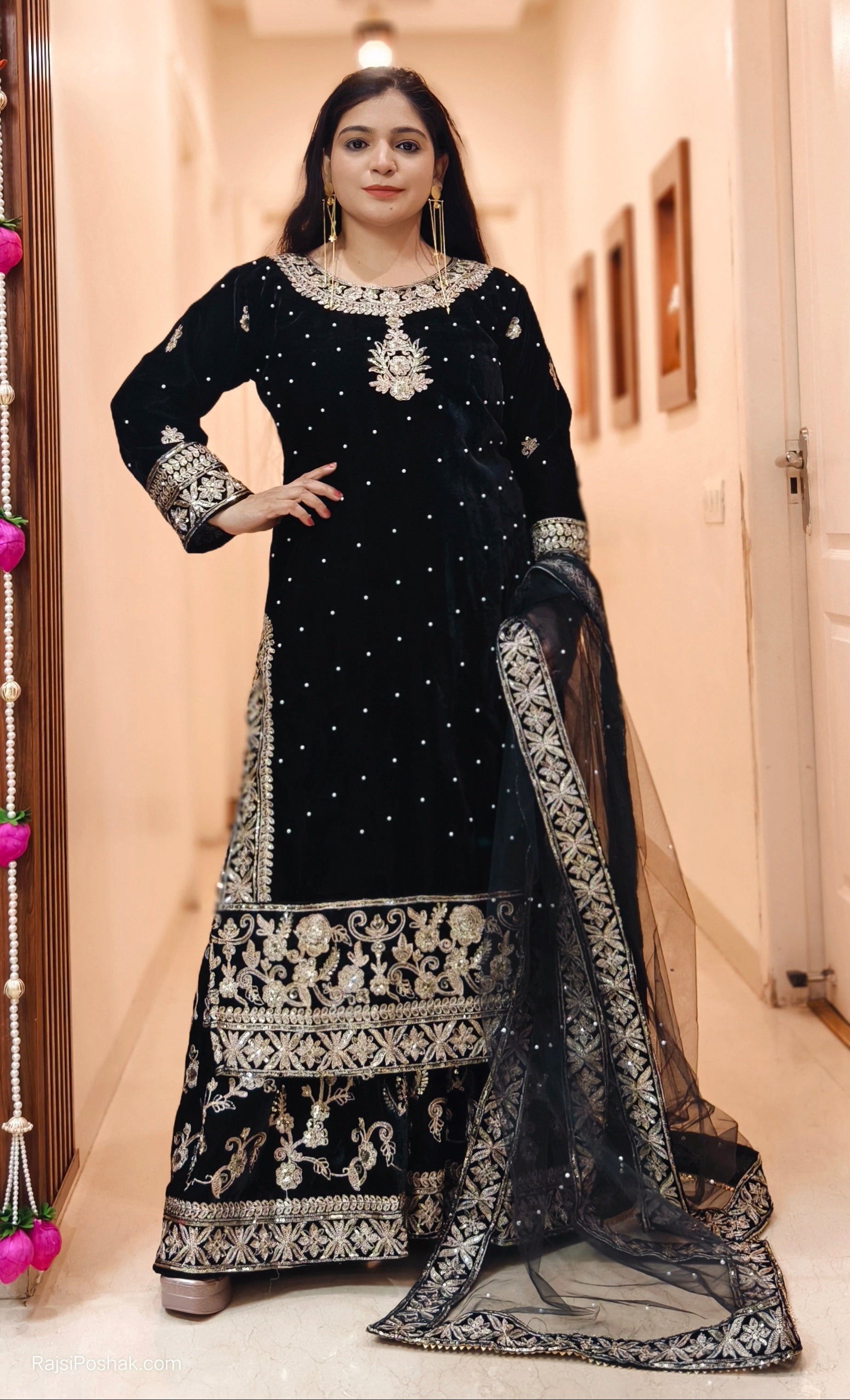 A must have BLACK SYTLISH VELVET SUIT SET WITH DUPATTA AND SARARA your wardrobe.