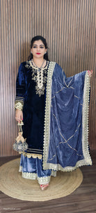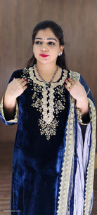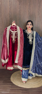 Elegant Velvet Salwar Suit, a stunning piece that exudes sophistication and charm. Crafted from luxurious velvet, this ensemble features intricate embroidery details that add a touch of artistry and elegance. The rich Blue & Maroon hue complements the beautiful designs, making it perfect for special occasions and celebrations. Paired with a matching dupatta, this salwar suit is sure to make a statement wherever you go. Experience comfort and style in one exquisite outfit!