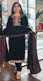 LUXURIOUS COFFEE & BROWN VELVET EMBROIDERED SUIT WITH VELVET DUPATTA Crafted from premium viscose velvet, this stunning piece features intricate embroidery that adds a touch of sophistication. The rich brown hue exudes confidence and charm, making it perfect for festive occasions or special events. The flowy silhouette ensures comfort while creating a dramatic look that will turn heads. Elevate your wardrobe with this exquisite Velvet Embroidered Suit that beautifully combines tradition and modern style
