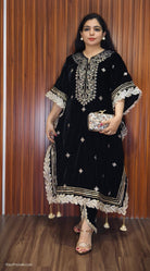 LUXURIOUS PURPLE & BLACK VELVET EMBROIDERED SUIT WITH VELVET DUPATTA Crafted from premium viscose velvet, this stunning piece features intricate embroidery that adds a touch of sophistication. The rich brown hue exudes confidence and charm, making it perfect for festive occasions or special events. The flowy silhouette ensures comfort while creating a dramatic look that will turn heads. Elevate your wardrobe with this exquisite Velvet Embroidered Suit that beautifully combines tradition and modern style
