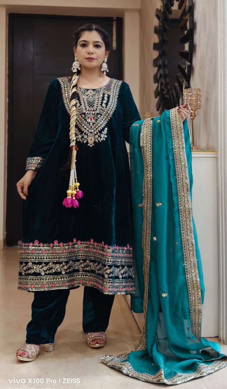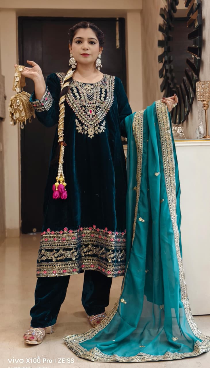 This elegant PEACOCK BLUE VELVET ANARKALI WITH BEAUTIFUL DUPATTA features intricate work, adding a touch of sophistication to your wardrobe. The suit comes with a matching dupatta, completing the look with a cohesive and stylish ensemble. Perfect for special occasions this outfit is sure to make a statement and turn heads wherever you go.
