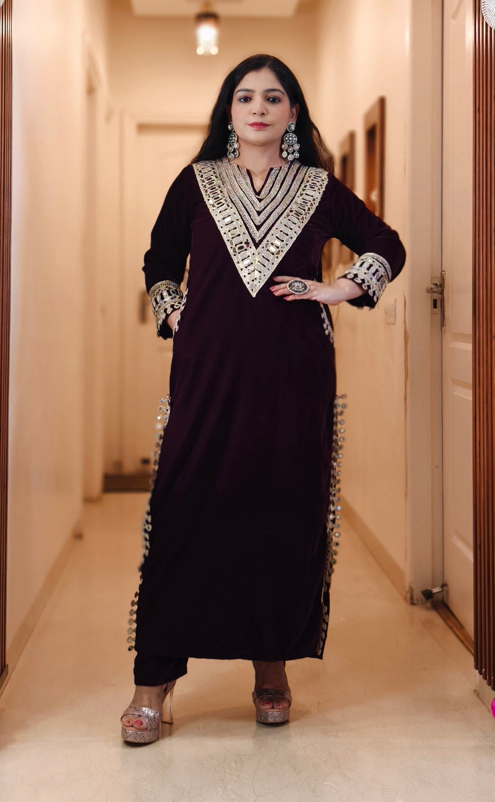 WINE PREMIUM LONG VELVET SUIT WITH REAL MIRROR AND DUPATTA