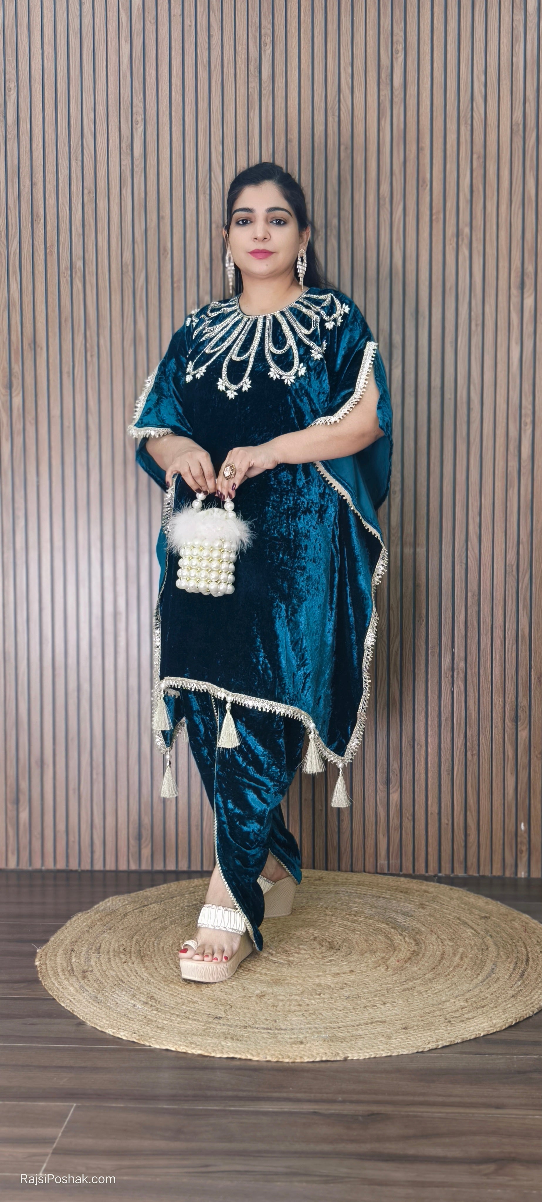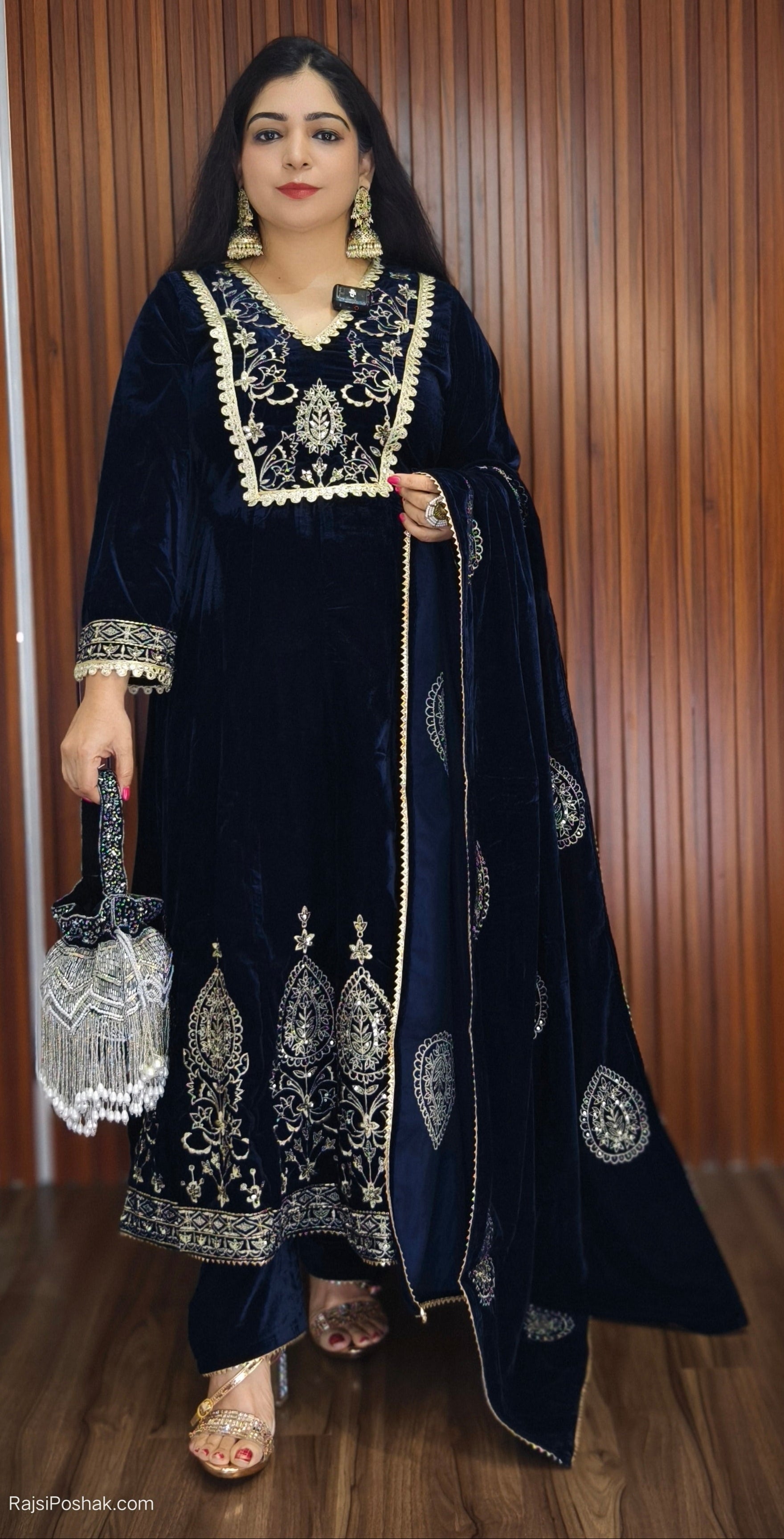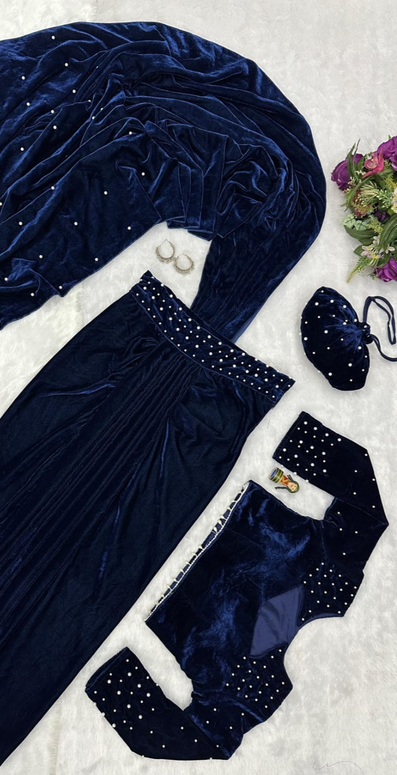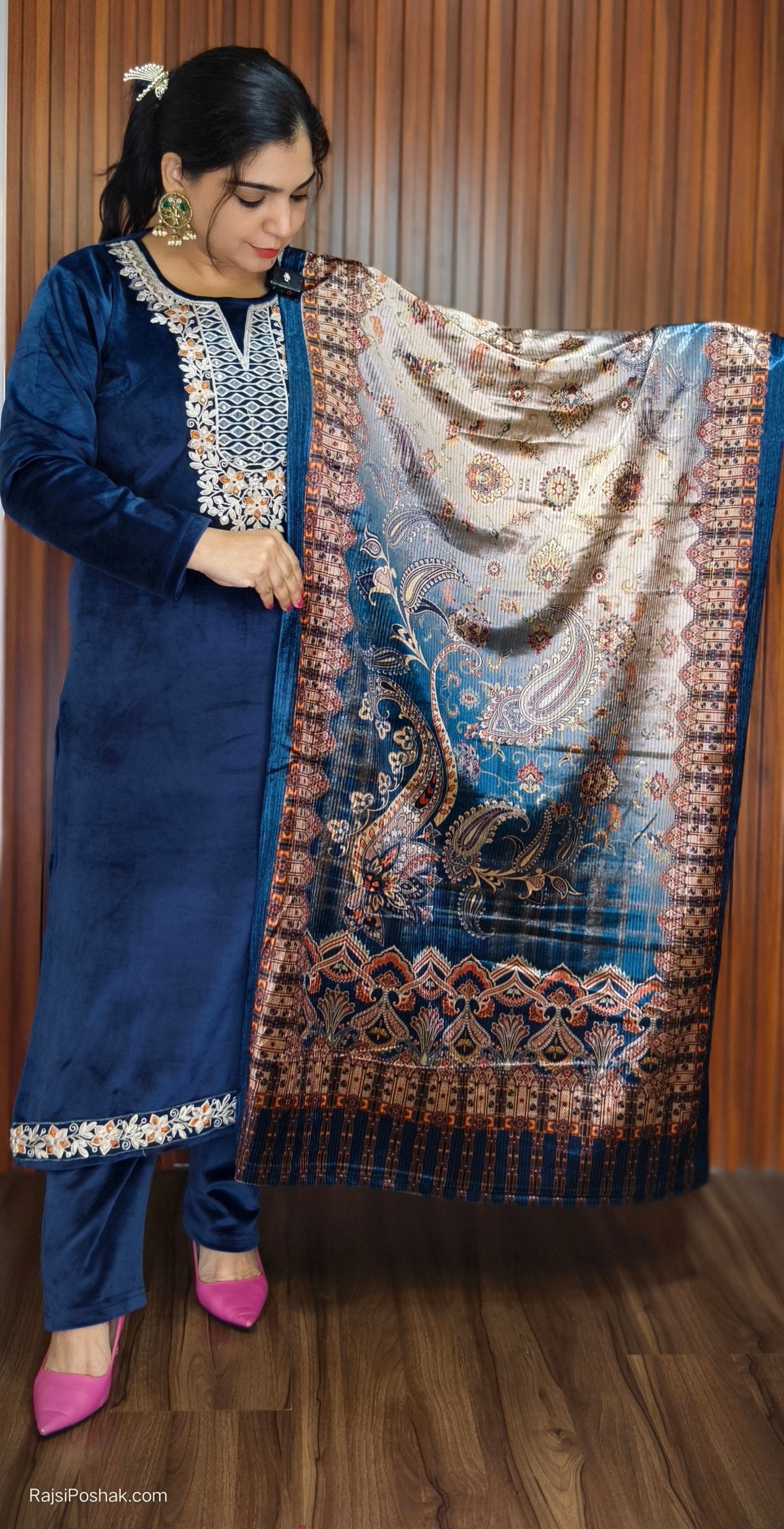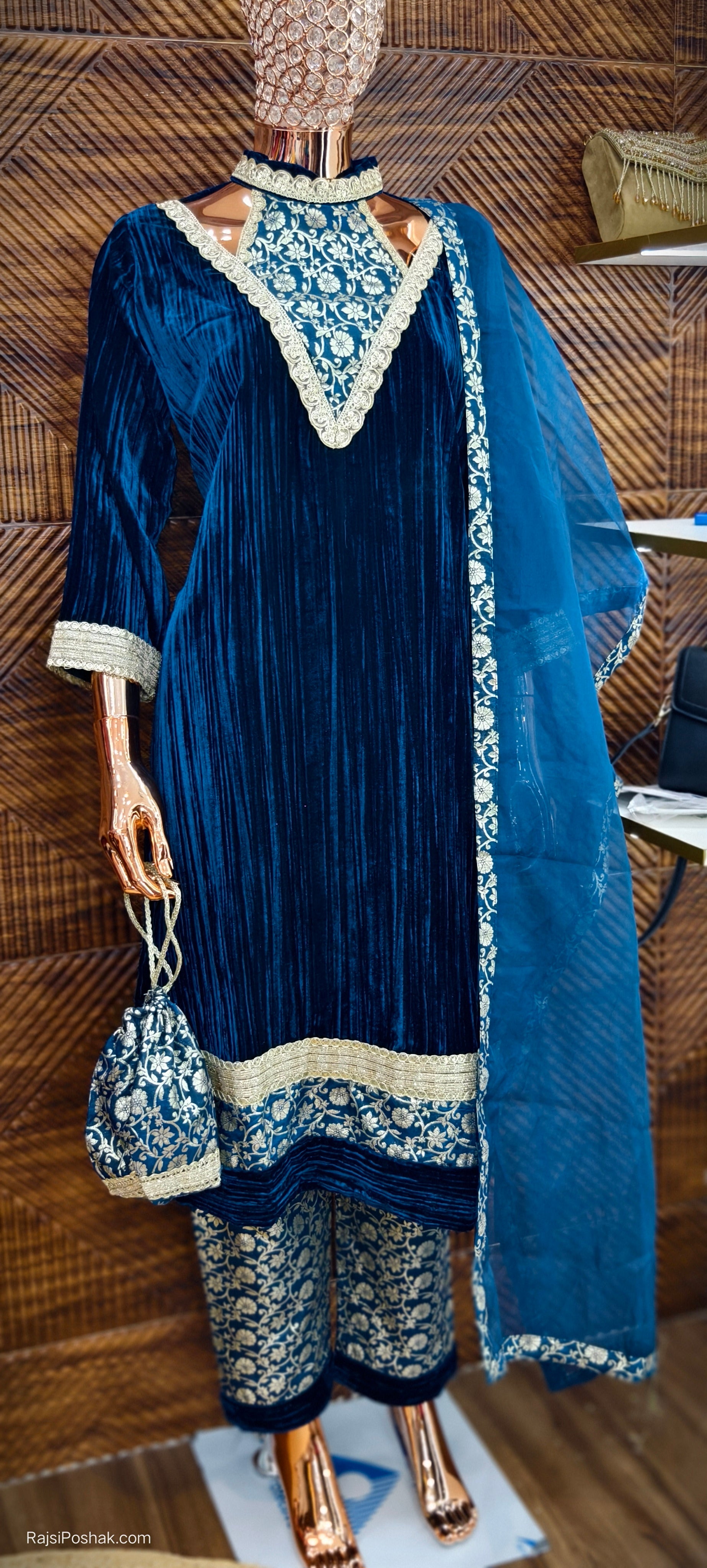 RAMA BLUE AND MAROON SYTLISH VELVET COORDSET WITH NECK EMBROIDERY AND POTLI