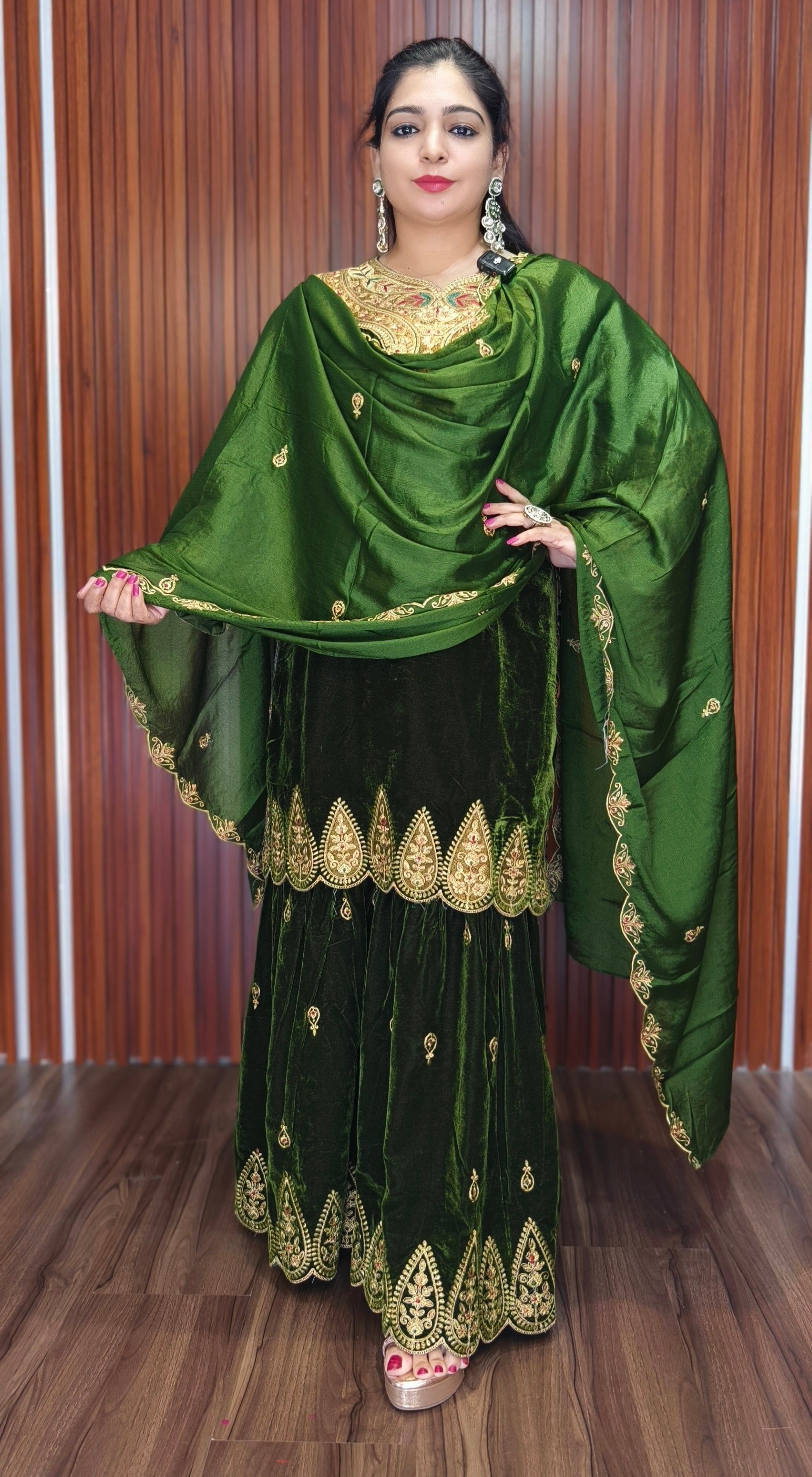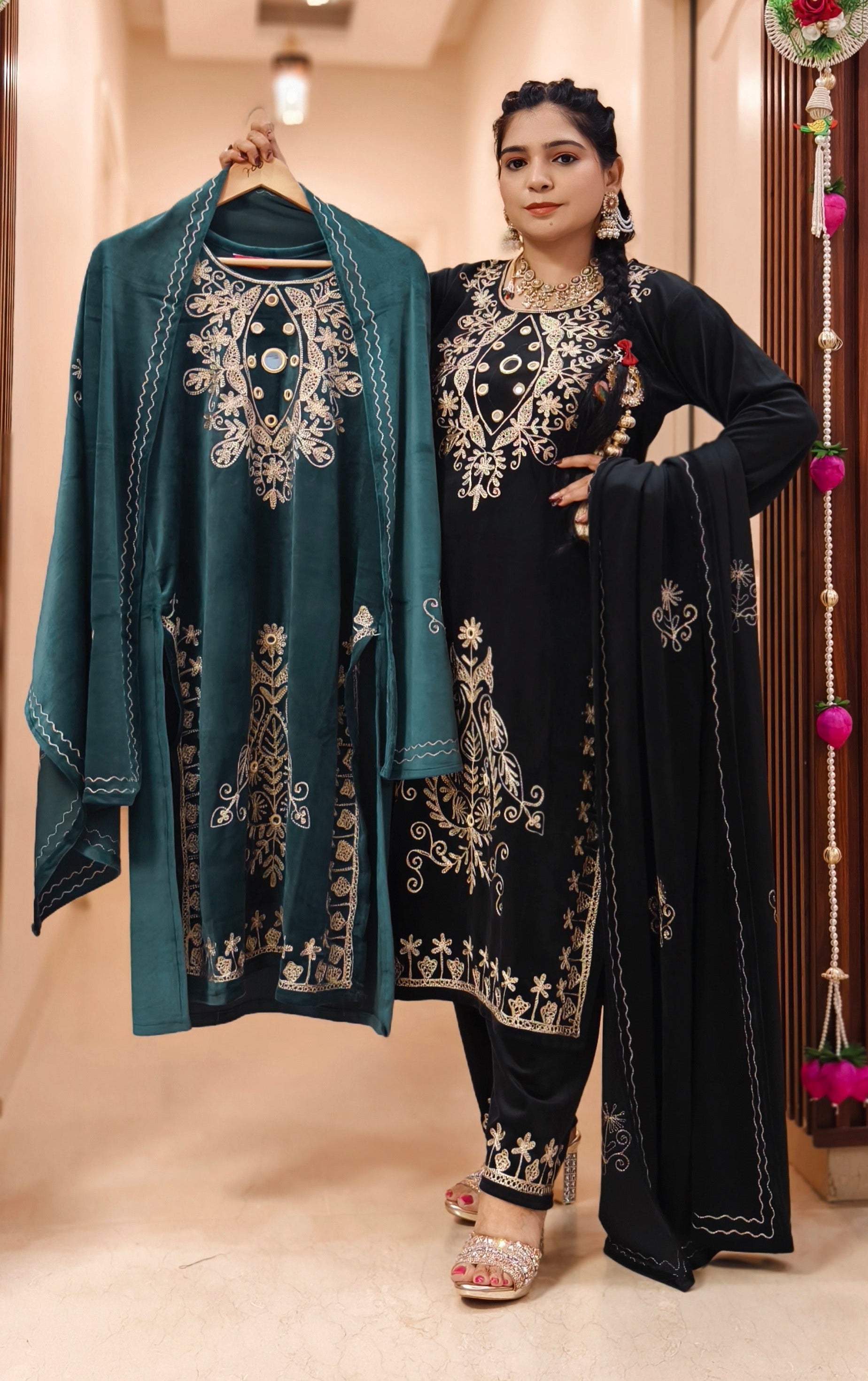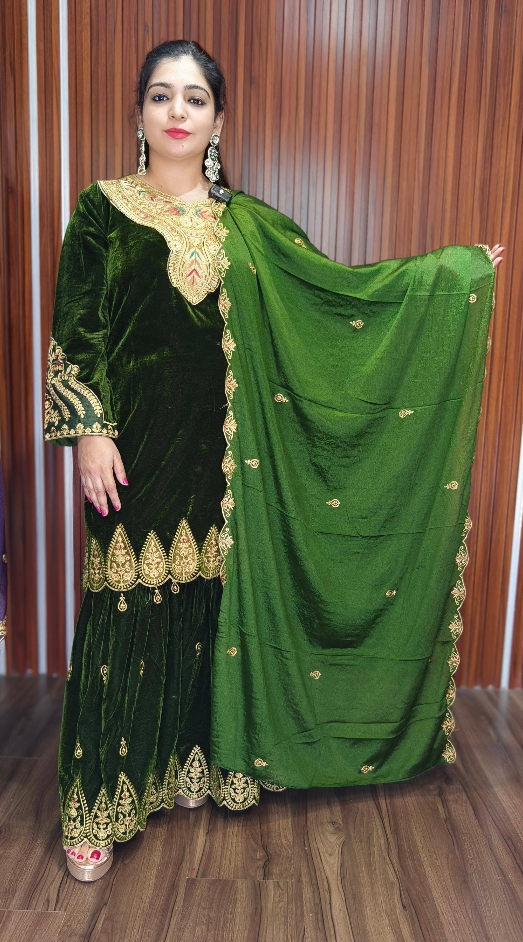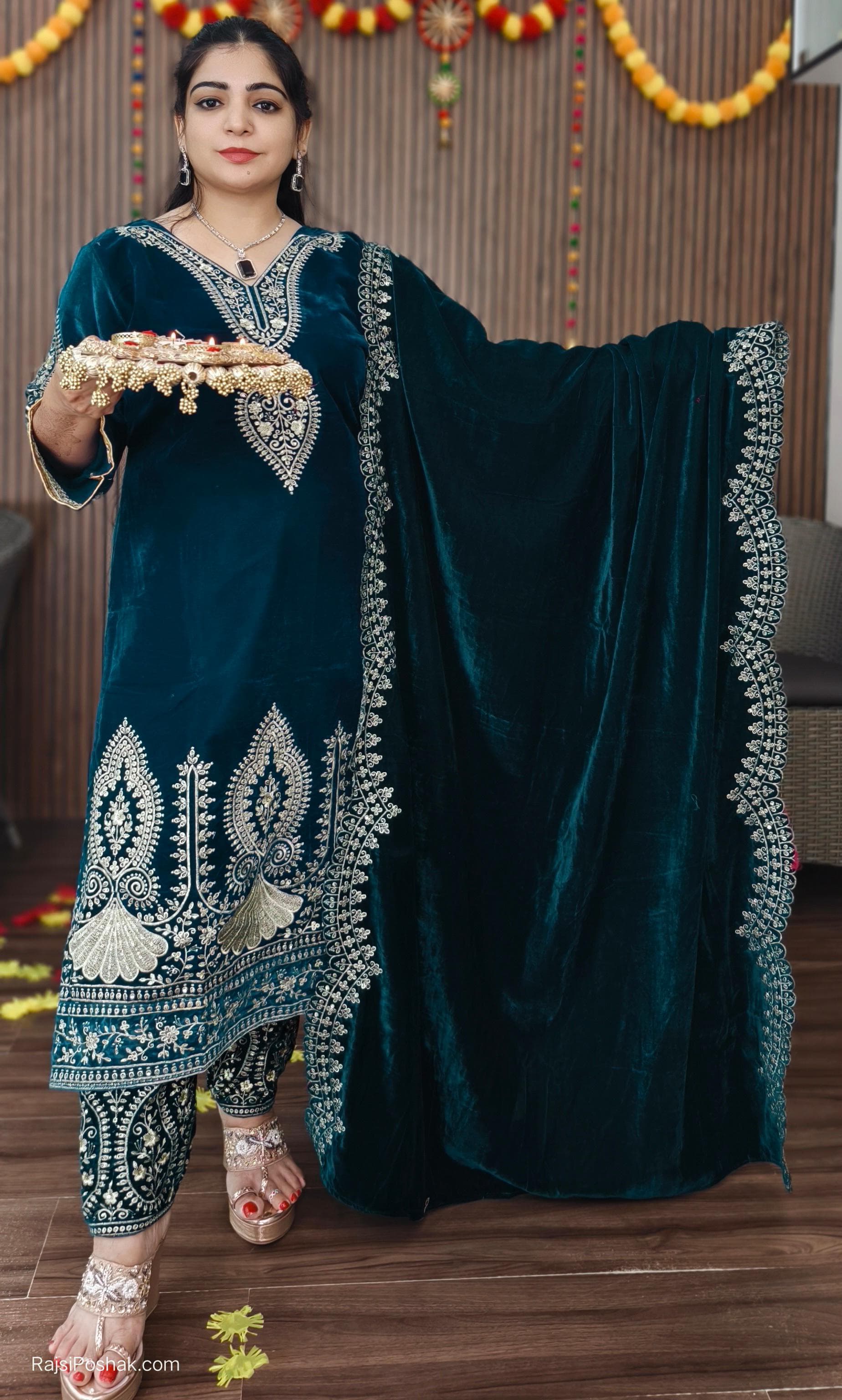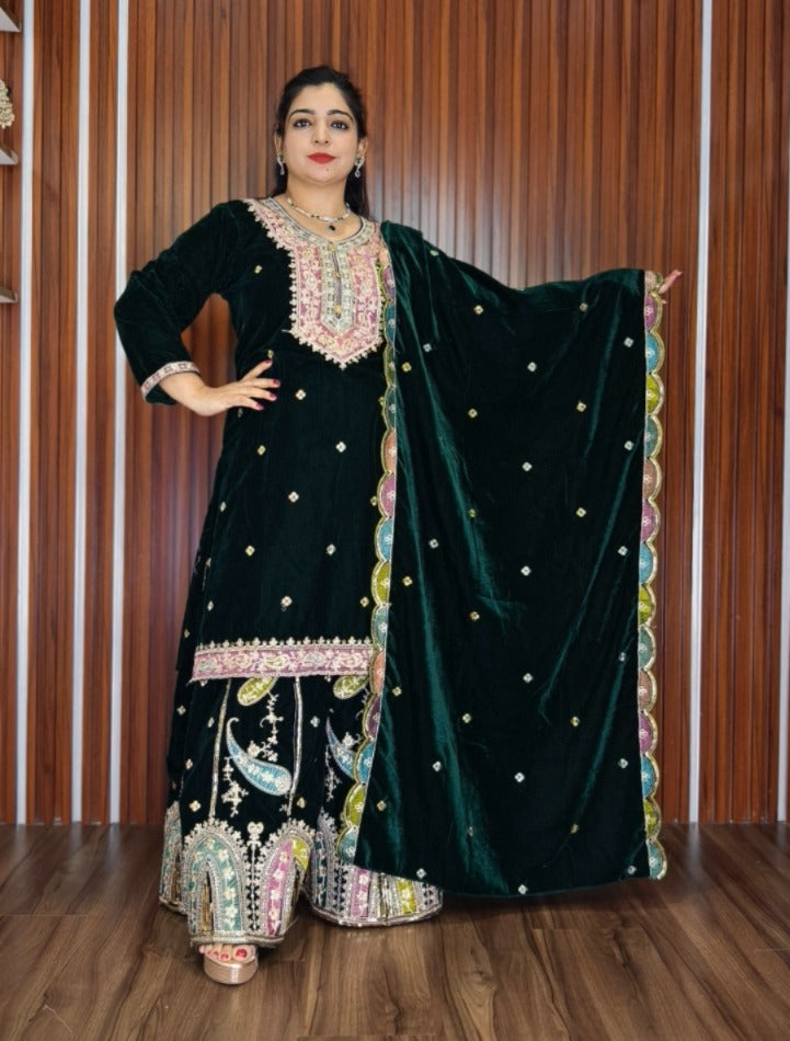 GREEN PREMIUM VELVET COORD SET WITH DESIGNER WORK AND JACKET
