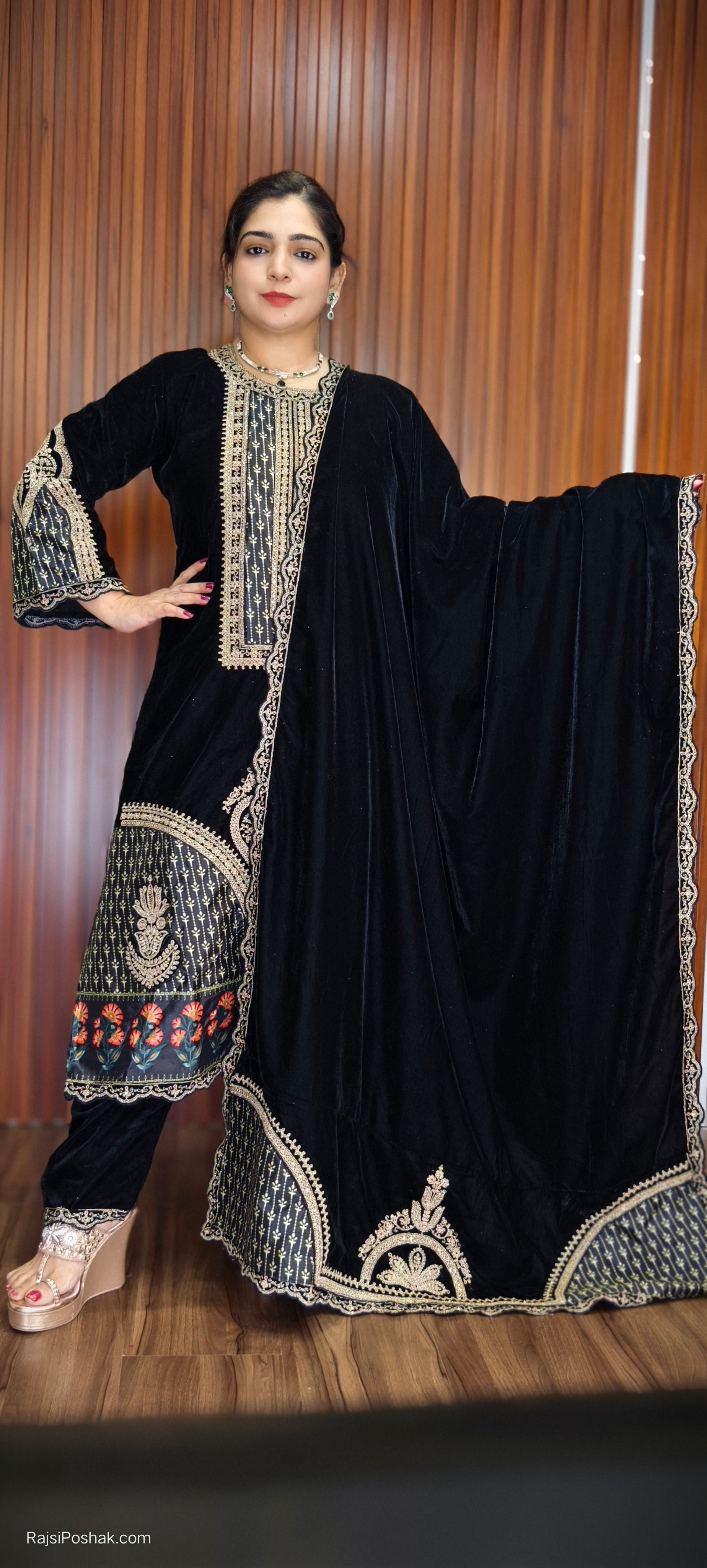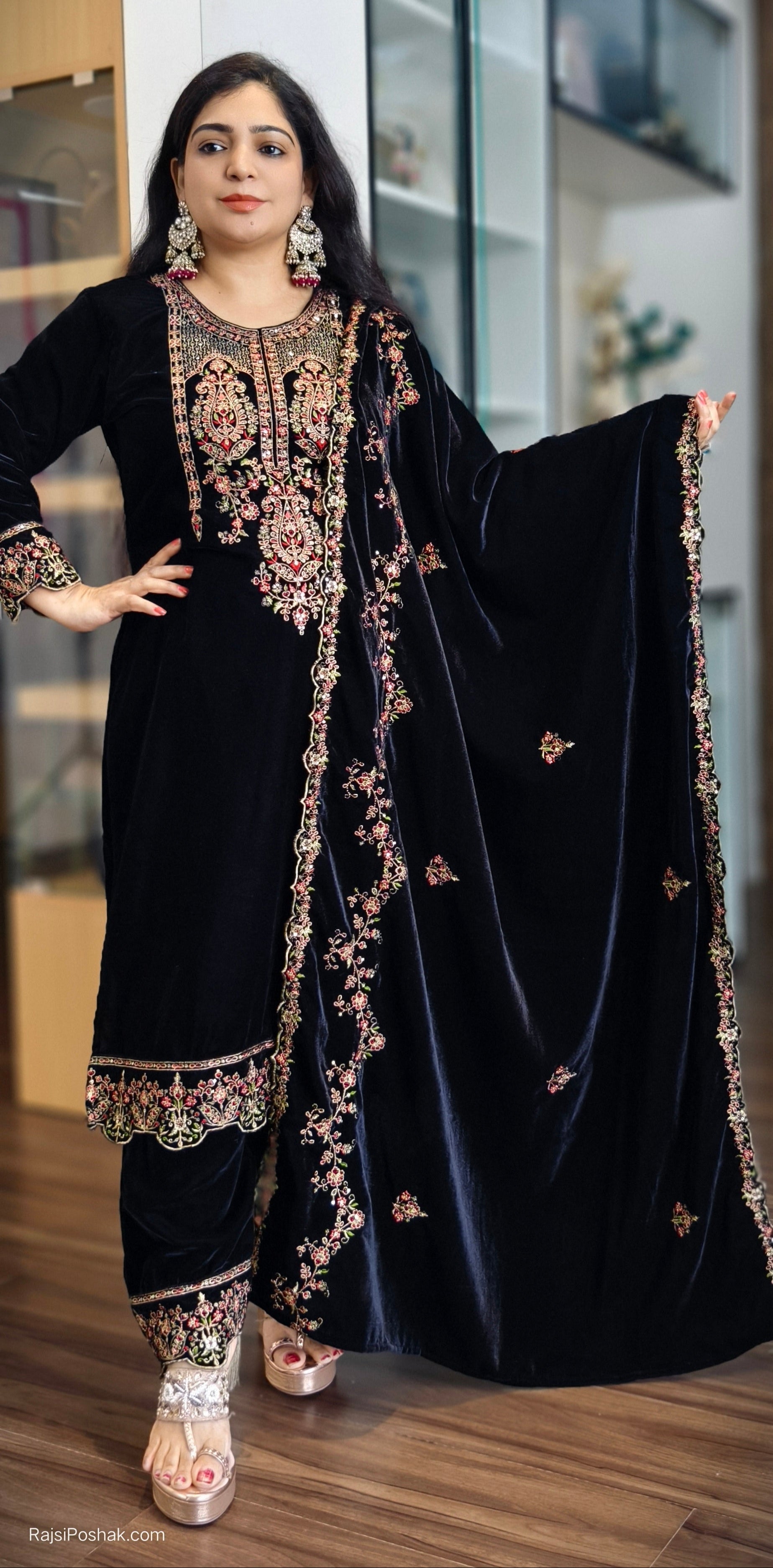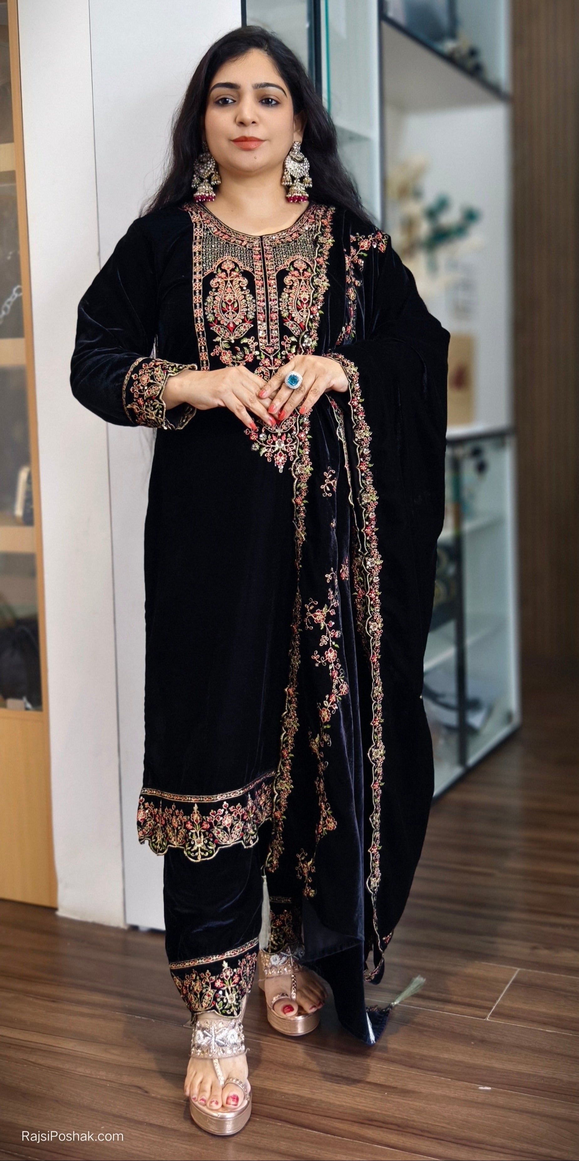 BLACK IMPORTED VELVET 2-PIECE COORD SET WITH EMBROIDERY WORK