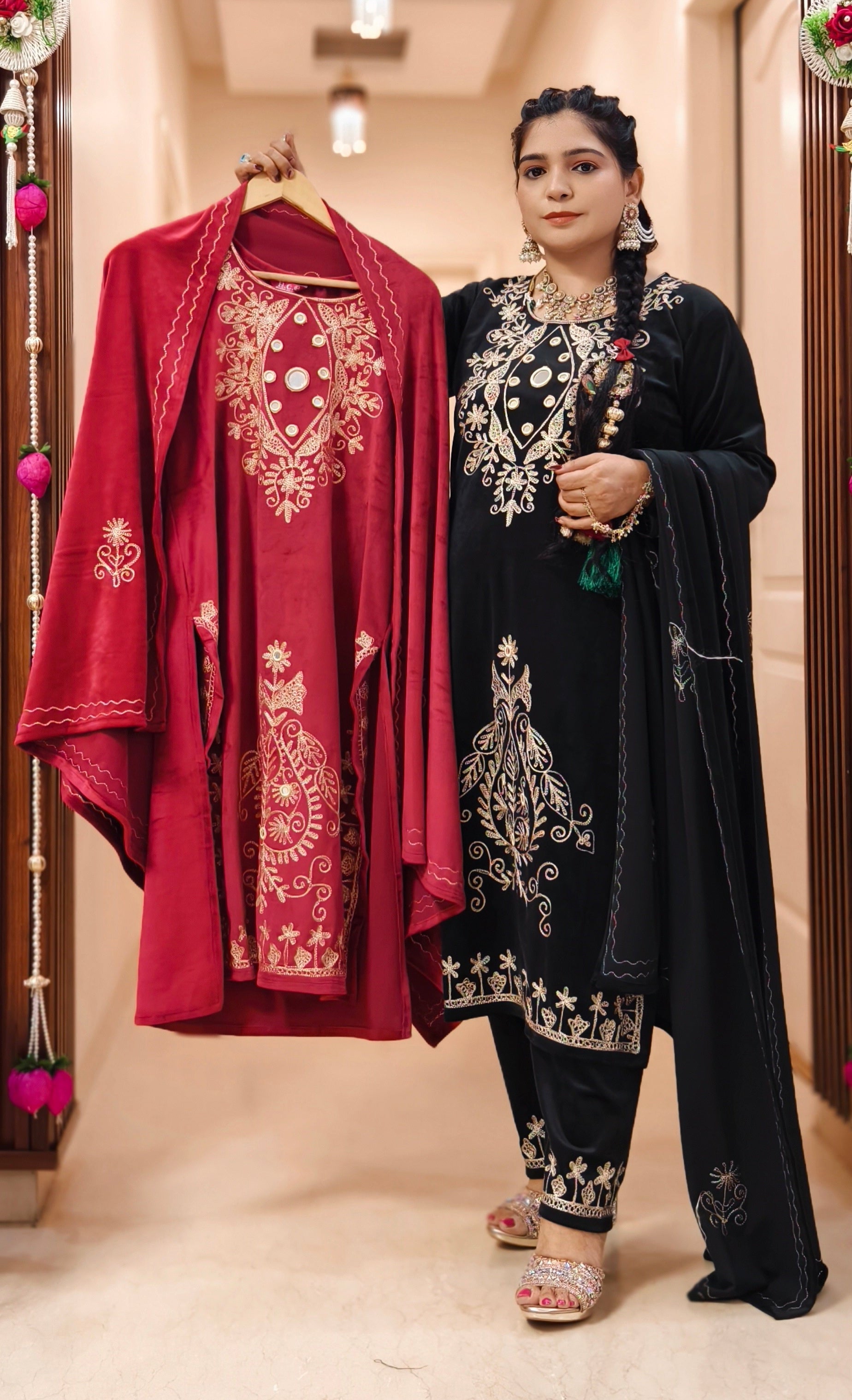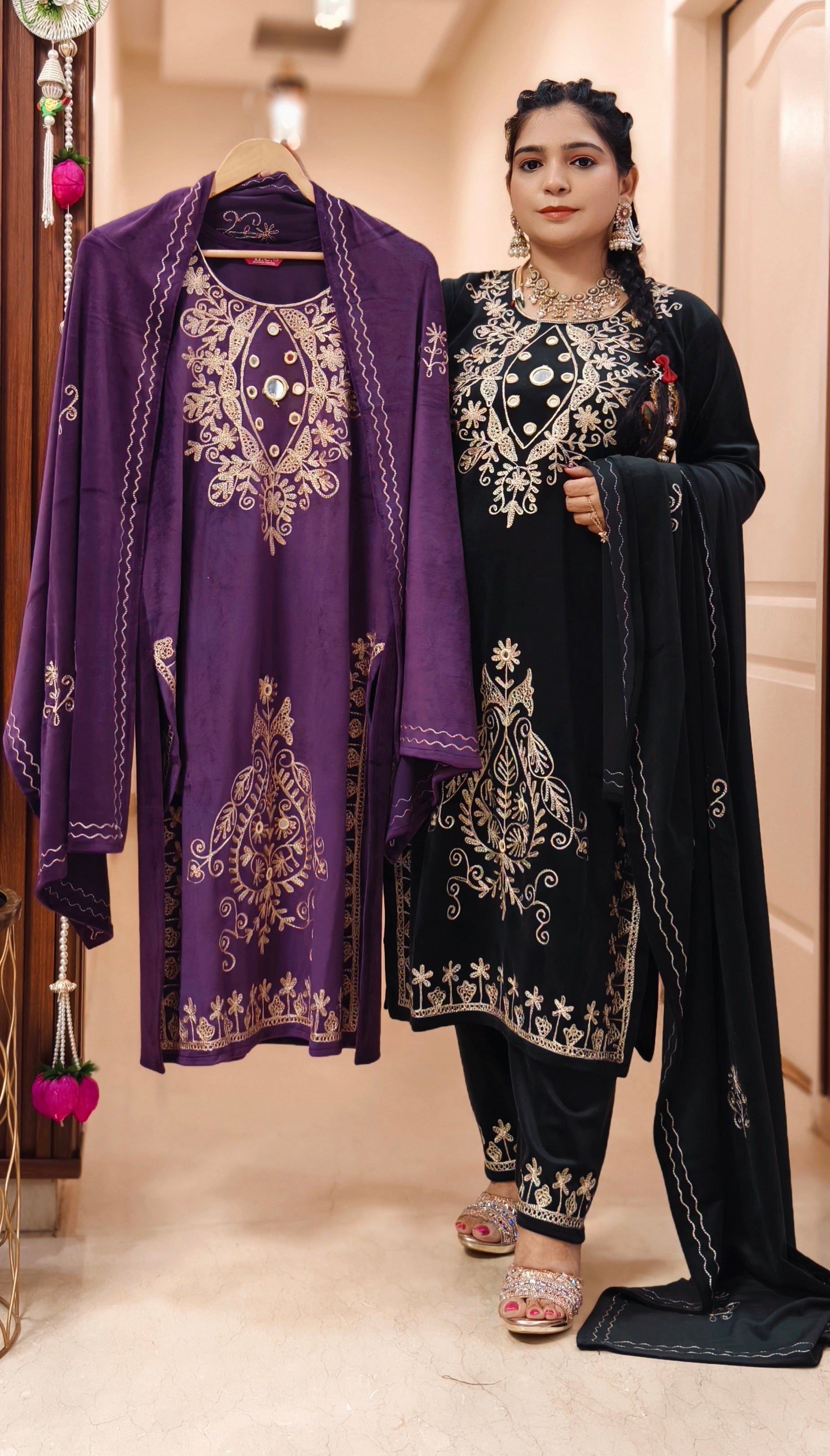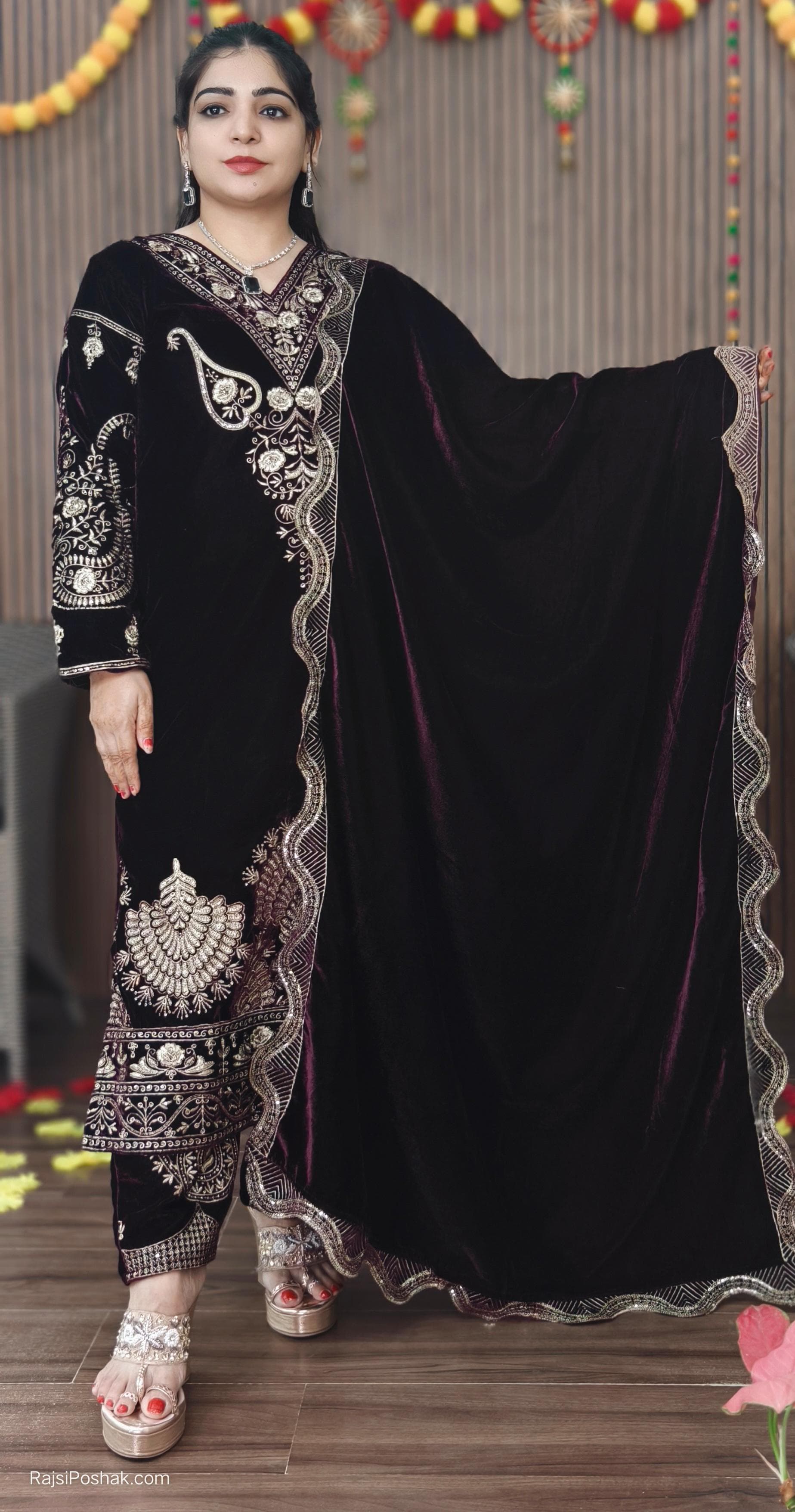 BLACK,PURPLE AND MAROON IMPORTED VELVET 2-PIECE COORD SET WITH EMBROIDERY WORK