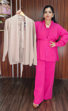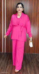 Elevate your wardrobe with the 3 PCS WINTER WEAR COORDSET WITH BELT. This stunning set features a luxurious satin silk fabric that drapes beautifully against the skin, offering both comfort and sophistication. The vibrant fuchsia color adds a bold pop to your ensemble, making it perfect for both day and evening wear. The set includes a sleek top with a flattering cut and matching bottoms that create a seamless and chic look.