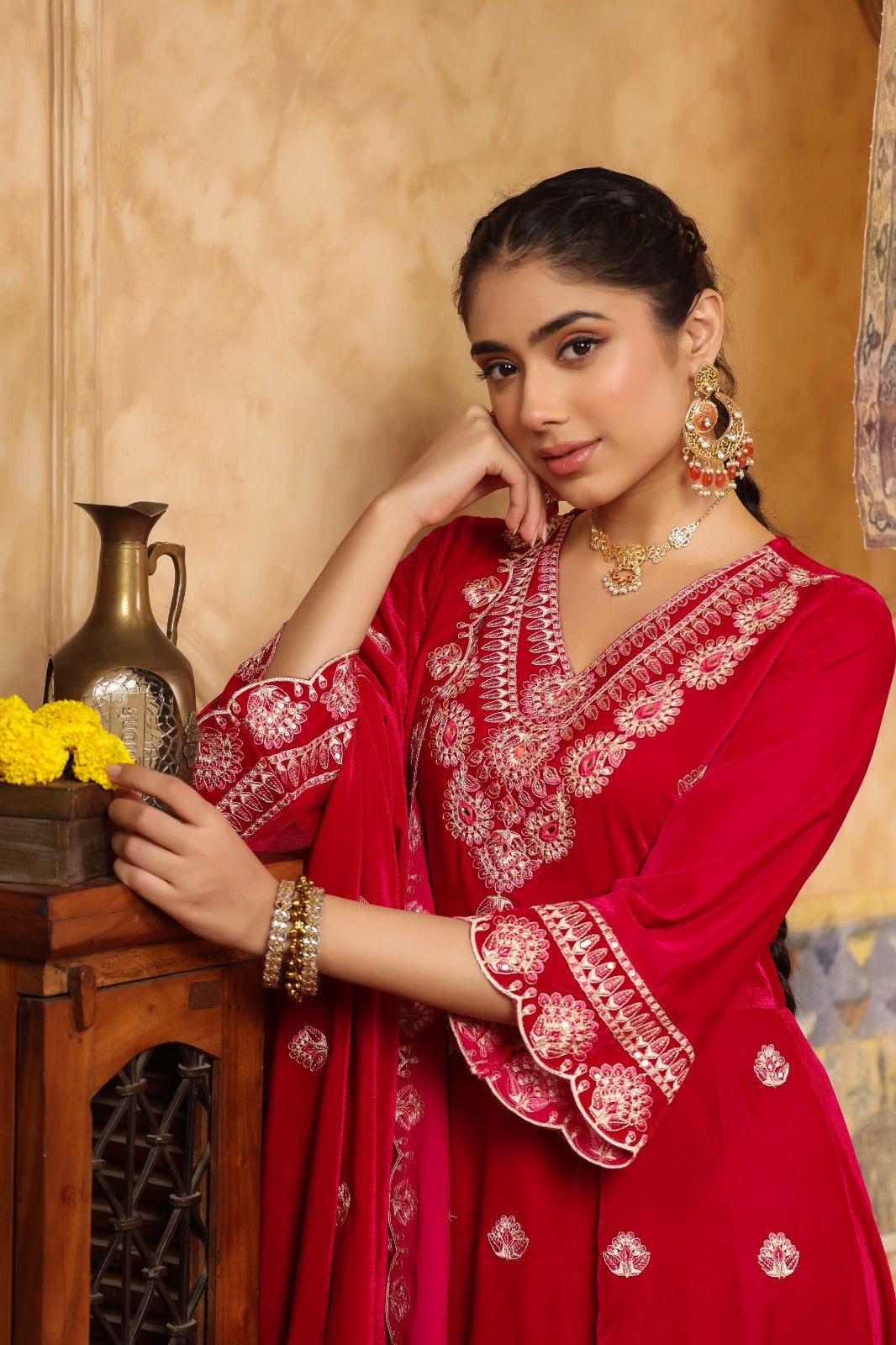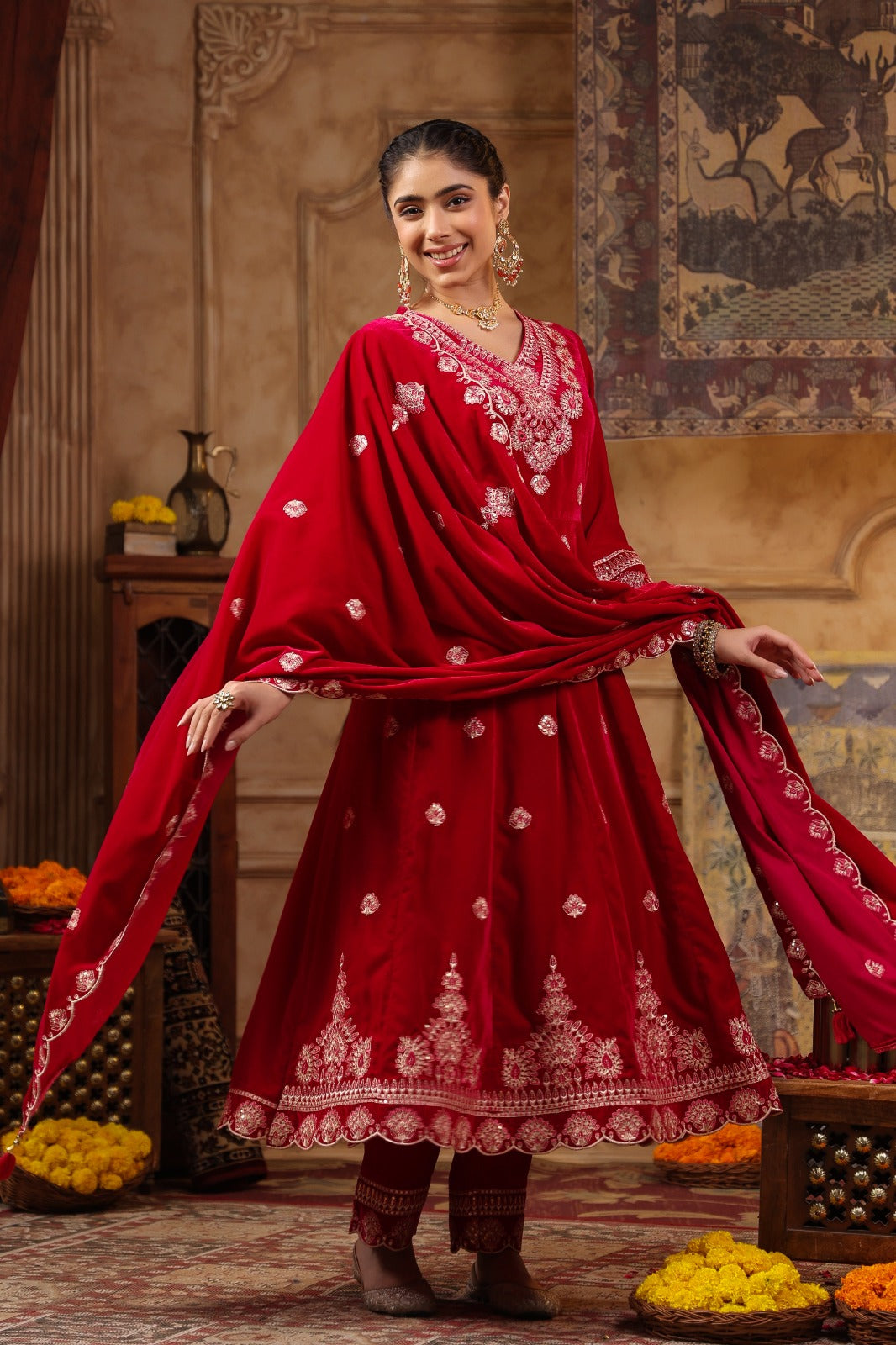 This elegant PINK VELVET ANARKALI WITH BEAUTIFUL DUPATTA features intricate work, adding a touch of sophistication to your wardrobe. The suit comes with a matching dupatta, completing the look with a cohesive and stylish ensemble. Perfect for special occasions this outfit is sure to make a statement and turn heads wherever you go.