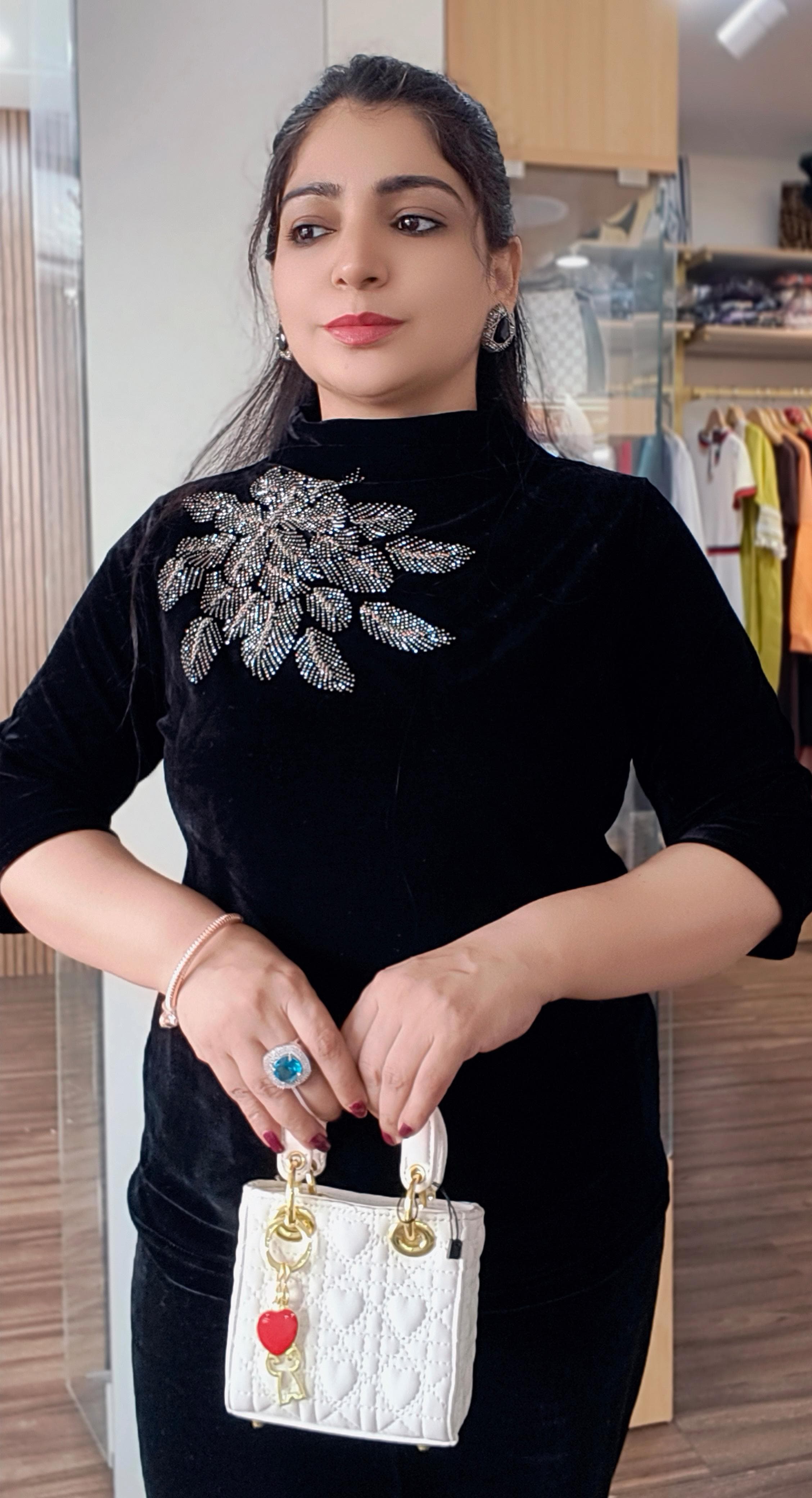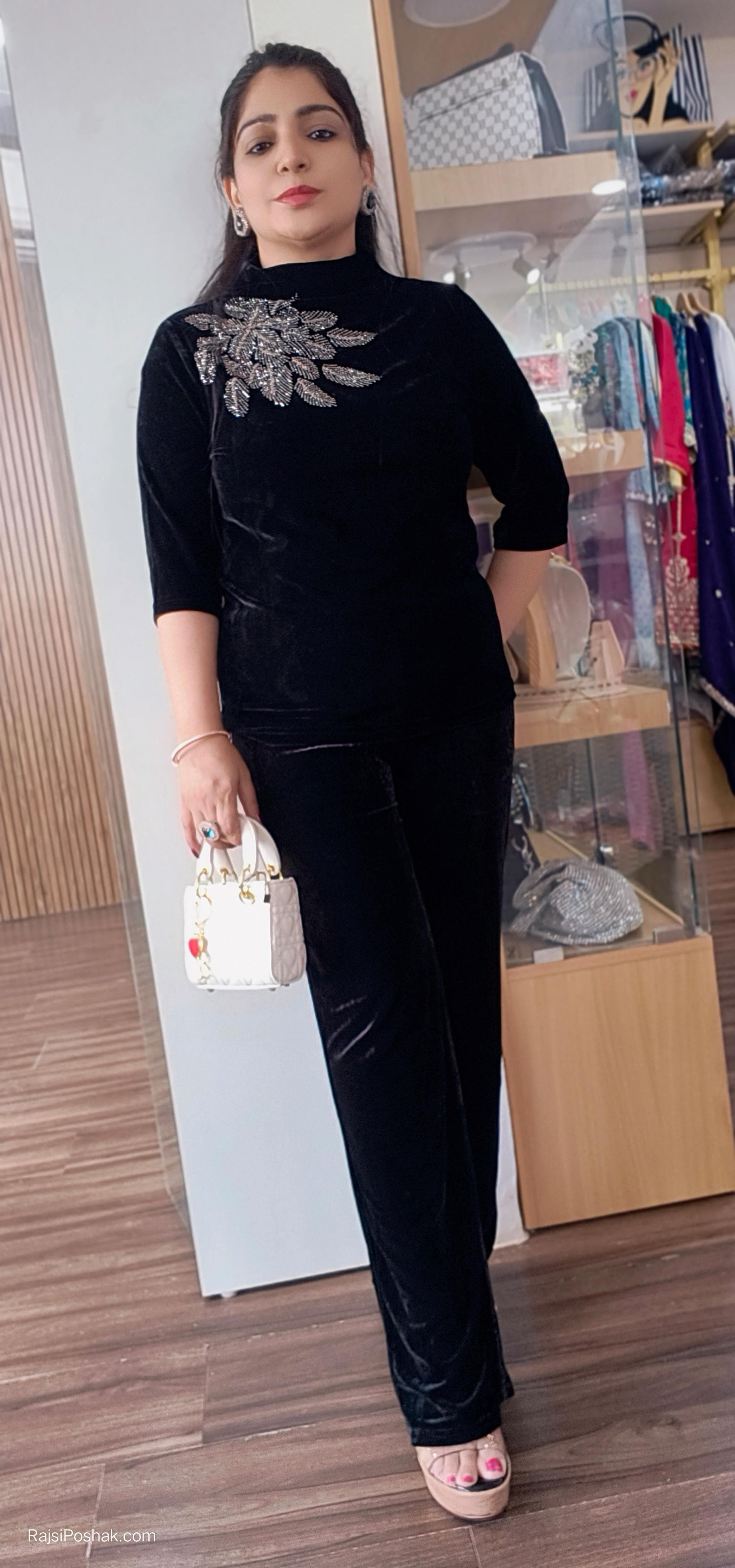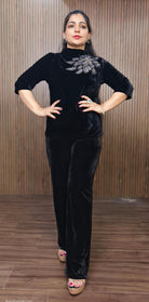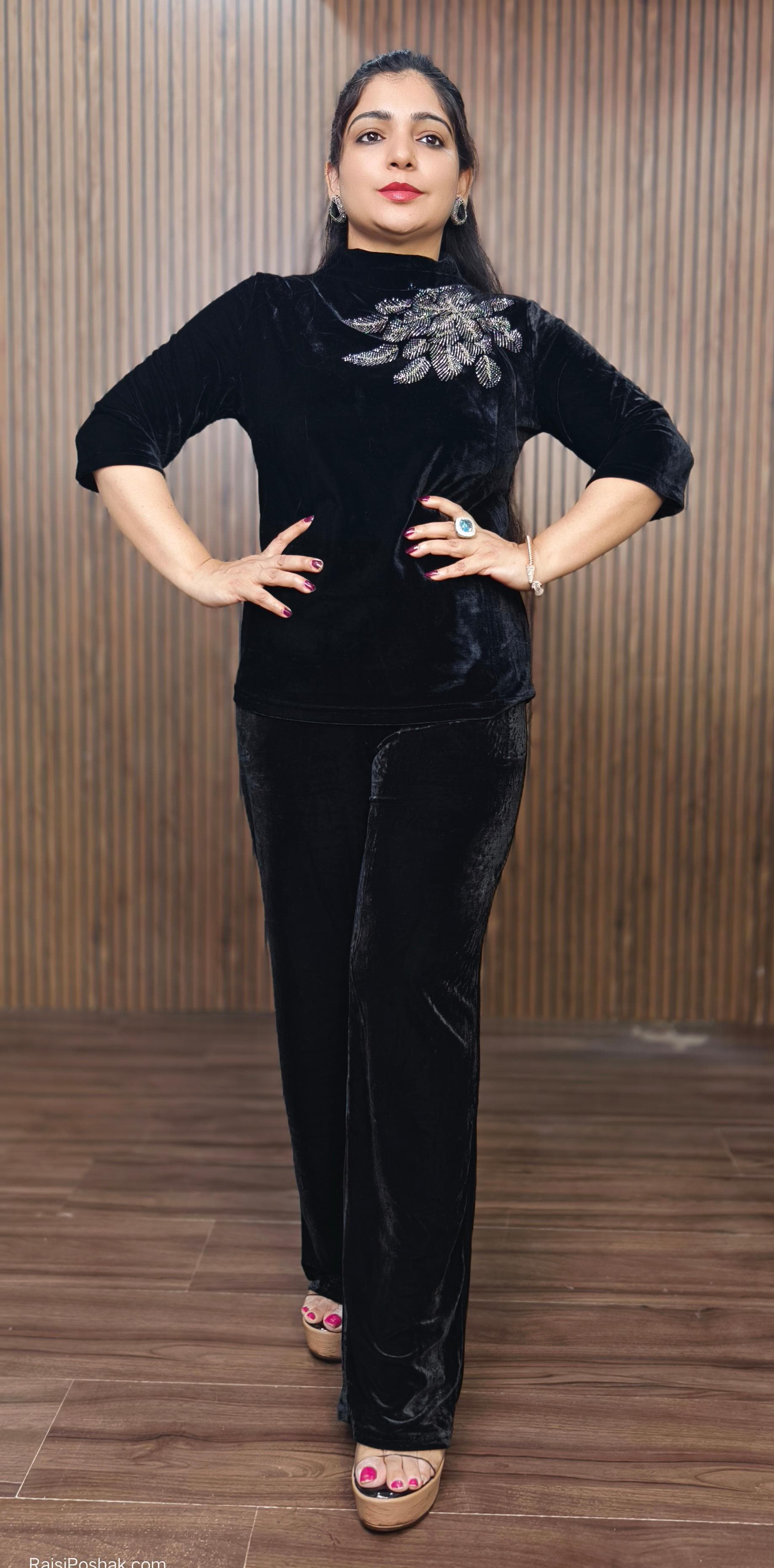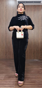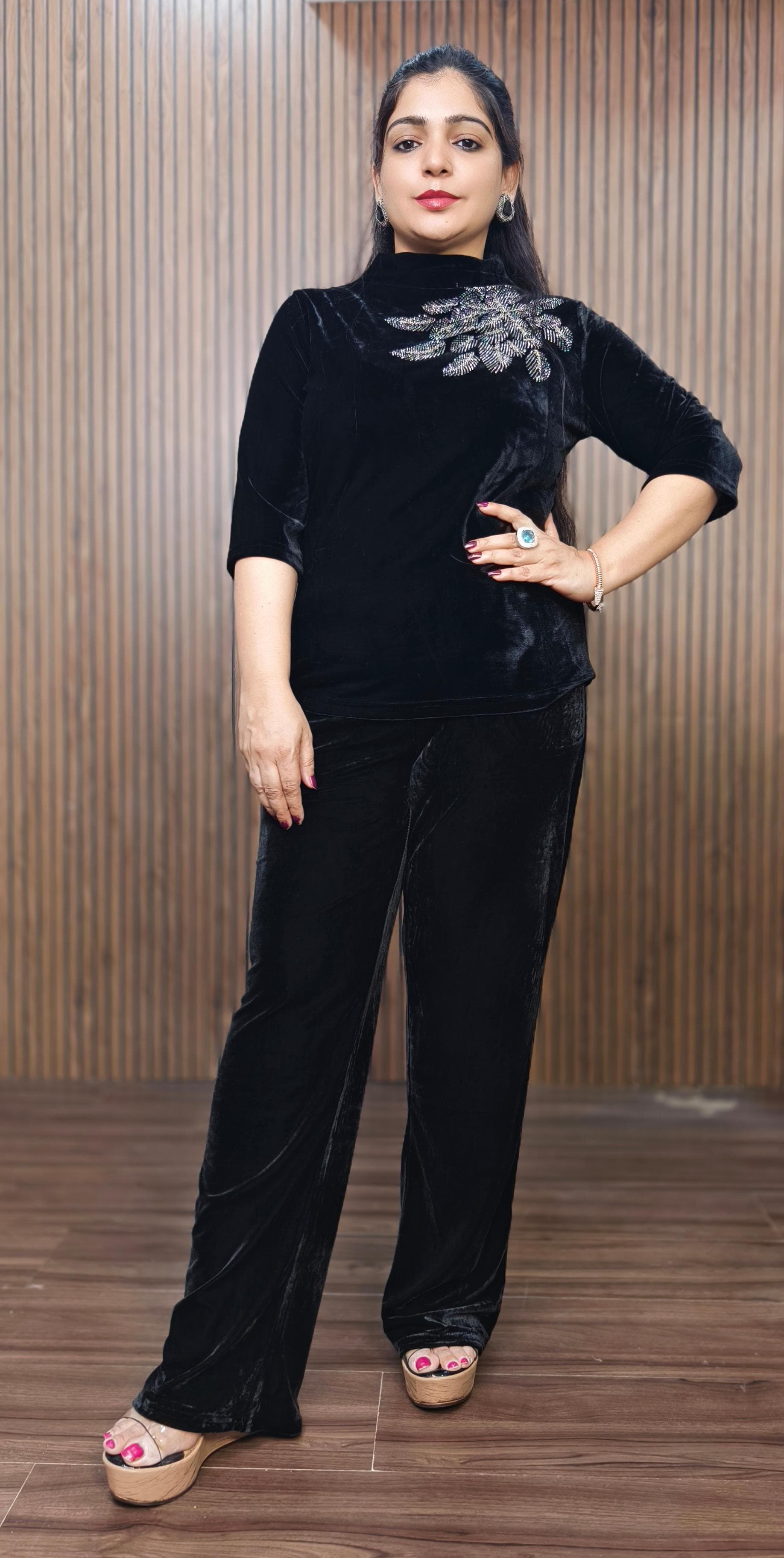 LUXURIOUS BLACK VELVET CO-ORD SET. Crafted from plush velvet, this elegant piece drapes beautifully, offering a flattering silhouette that enhances your figure. The full-leg design adds an air of refinement, making it ideal for both formal occasions and stylish gatherings. With its versatile nature, you can dress it up with statement jewelry or keep it chic and simple. Embrace effortless glamour and make a statement wherever you go