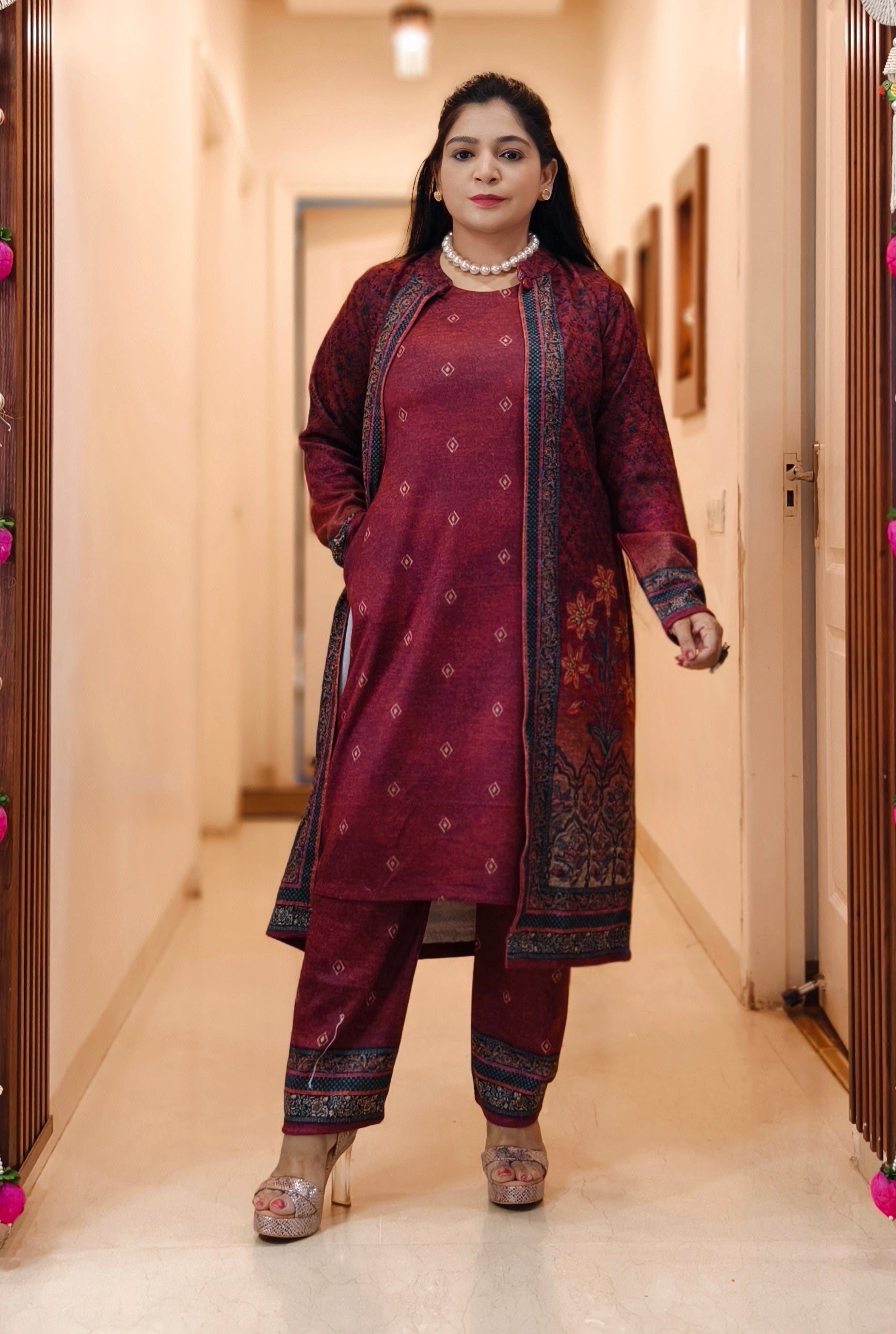 MAROON PASHMINA ELEGANT THREE-PIECE COORDINATED SET WITH JACKET