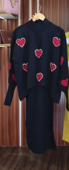 The ORANDESIGNE Women's Knitted Two-Piece Set is the perfect blend of style and comfort. This elegant set features a soft, knitted pullover adorned with beautiful love embroidery, paired with a flattering bodycon midi skirt. The pullover offers a cozy fit, while the bodycon skirt hugs your curves for a sleek silhouette. Ideal for parties, this sophisticated sweater dress set combines warmth with chic design, making it a versatile addition to your wardrobe.
