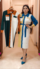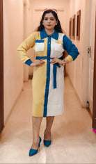YELLOW AND BROWN MULTICOLOR ONE PCS IMPORTED STRECHABLE DRESS WITH BELT