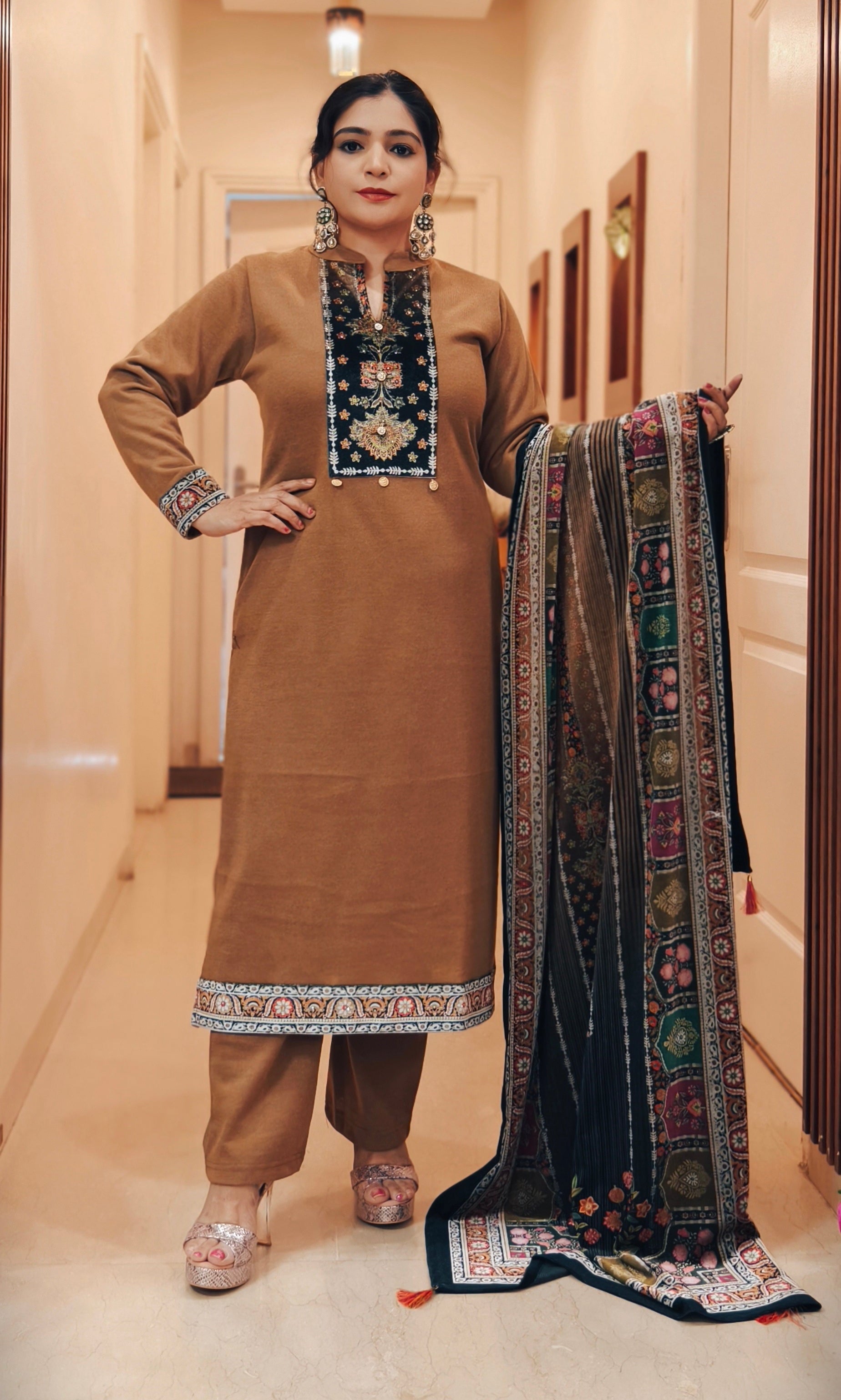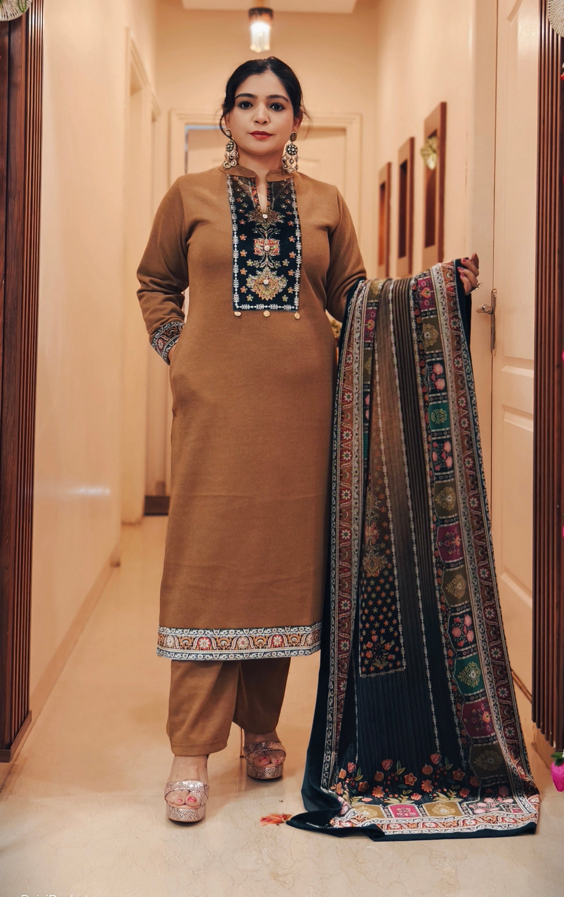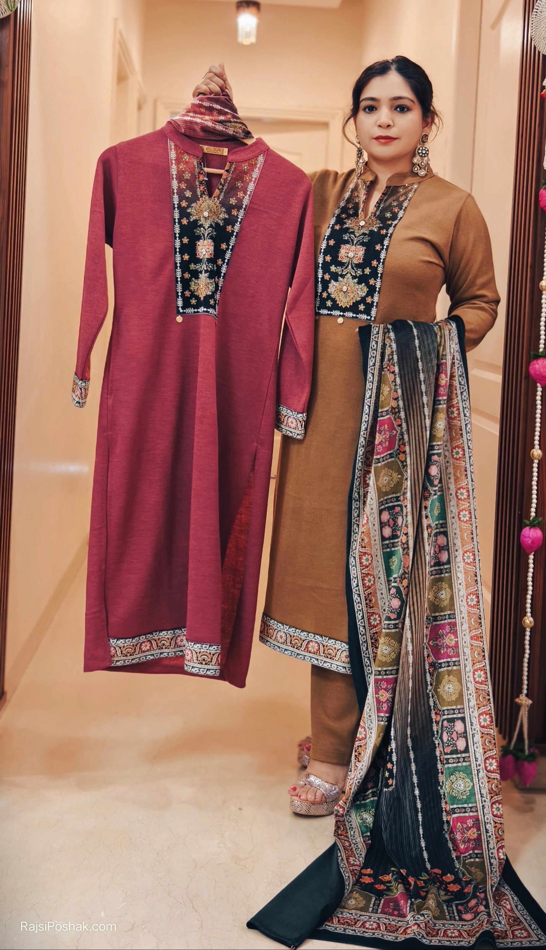 THIS YELLOW AND MAROON WOOLEN PARTY WEAR SUIT WITH EXQUISITE EMBROIDRED SUIT ADDING A TOUCH OF LUXURY AND SOPHISTICATION. THE RICH VELVET FABRIC OFFERS A VIBRANT LUSTER, MAKING IT THE PERFECT CHOICE FOR SPECIAL OCCASIONS. THE DELICATE EMBROIDERY ADORNS THE SUIT, CREATING A STUNNING COMBINATION OF TRADITIONAL ARTISTRY AND MODERN CHARM. IDEAL FOR PARTIES AND FORMAL EVENTS, THIS SUIT EXUDES CLASS AND EFFORTLESS STYLE.