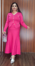 The ELEGANT WINTER DRESS FOR PARTIES - WOMEN'S KNITTED 3-PIECE SKIRT SET DRESS WITH LOVELY PULLOVER AND BODYCON MIDI SKIRT Women's Knitted Three-Piece Set is the perfect blend of style and comfort. This elegant set features a soft, knitted pullover adorned with beautiful love embroidery, paired with a flattering bodycon midi skirt. The pullover offers a cozy fit, while the bodycon skirt hugs your curves for a sleek silhouette. Ideal for parties, this sophisticated sweater dress set combines warmth with chic design, making it a versatile addition to your wardrobe.