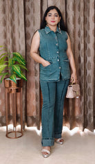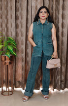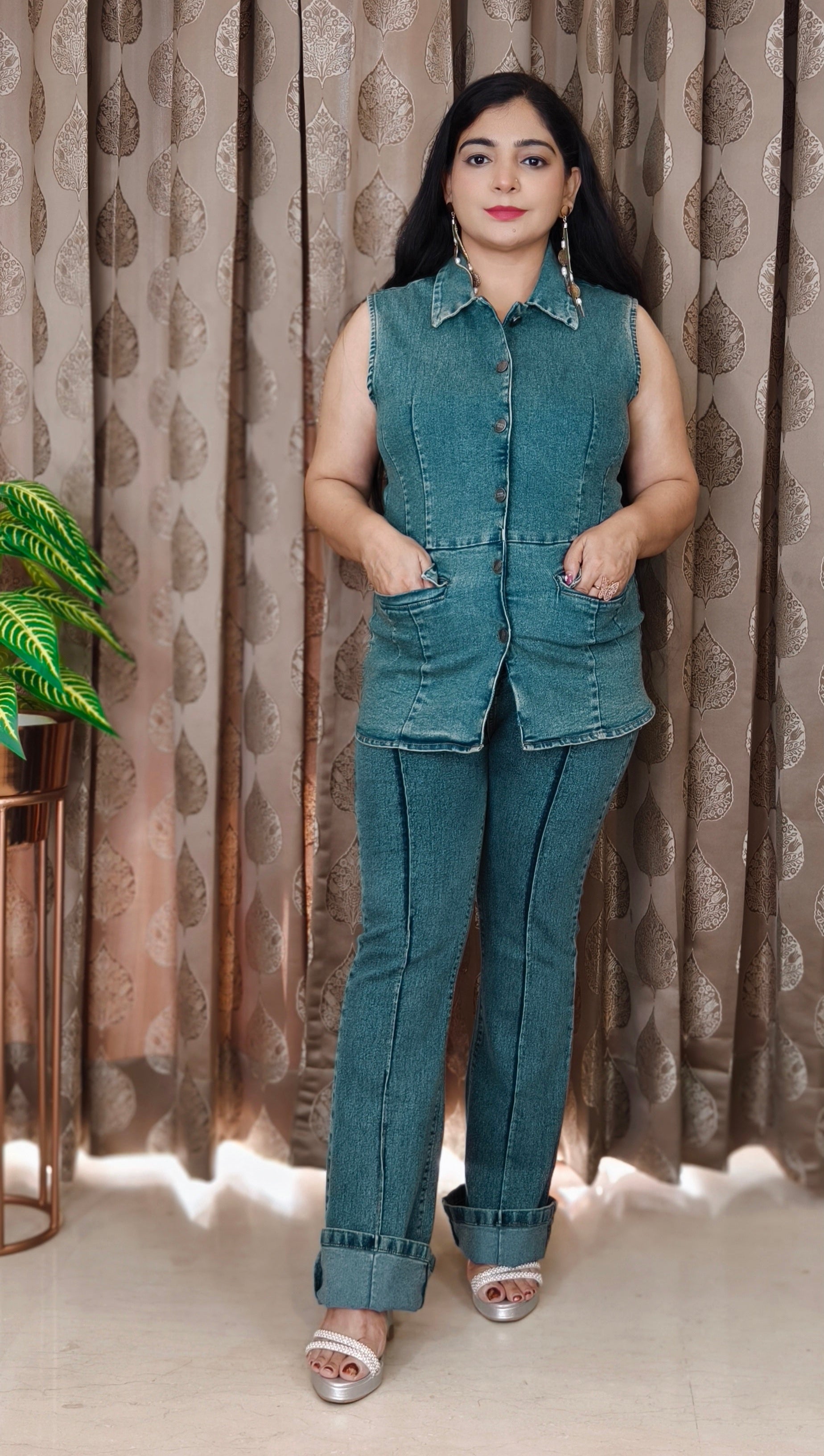 A must have DARK BLUE DENIM 2 PC SLEEVELESS CORDSET in your wardrobe.
