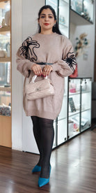 The EMBROIDERED KNITTED DRESS combines cozy comfort with intricate craftsmanship. Made from soft, high-quality knit fabric, it features delicate embroidery details that add a touch of elegance and artistry. The design typically includes floral patterns, geometric shapes, or other decorative motifs, enhancing the overall look of the dress. This versatile piece is perfect for both casual and semi-formal occasions, offering warmth, style, and a unique visual appeal.