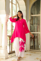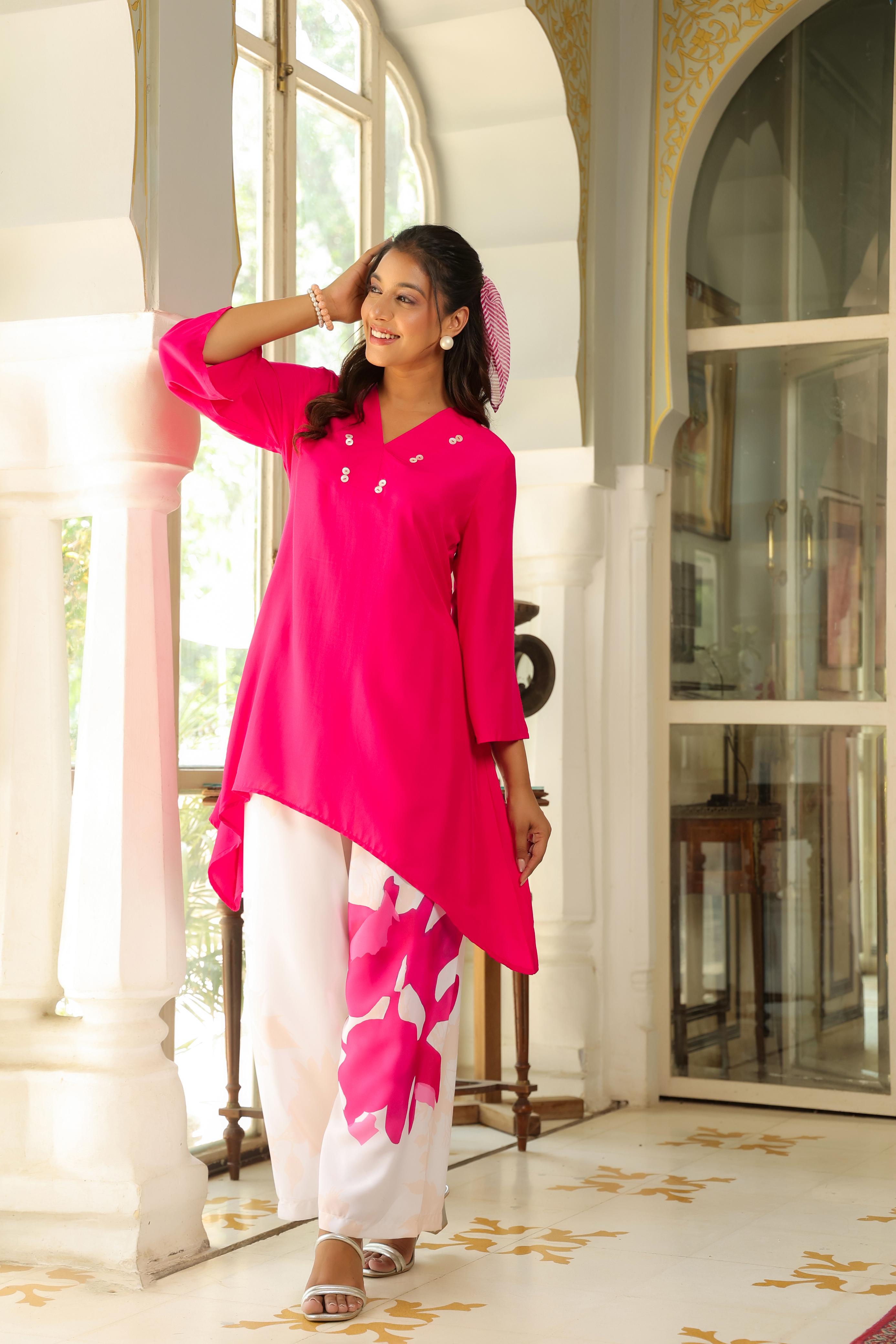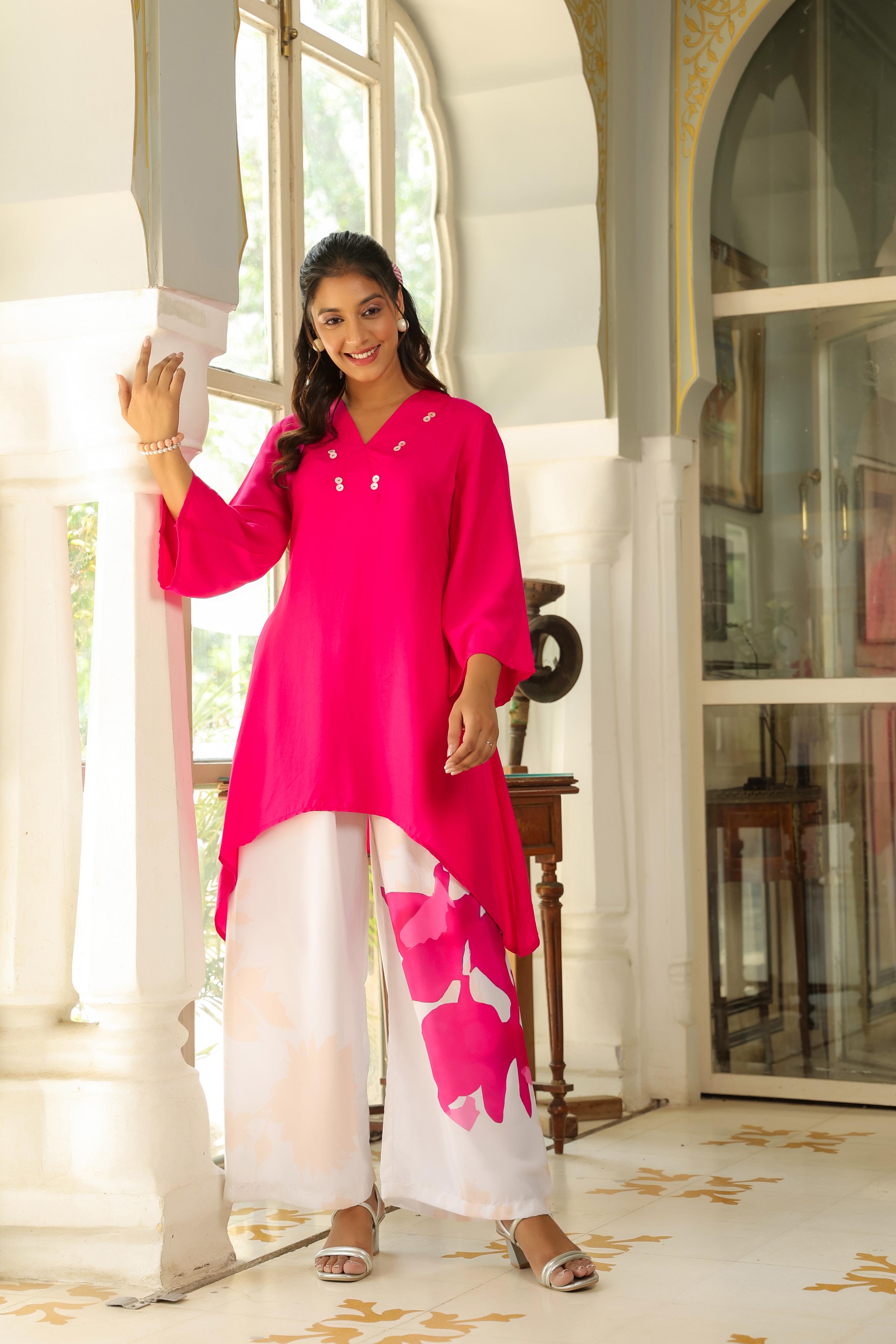 PINK COTTON LONG COORDSET WITH PLAZO AND FLOWER PRINT